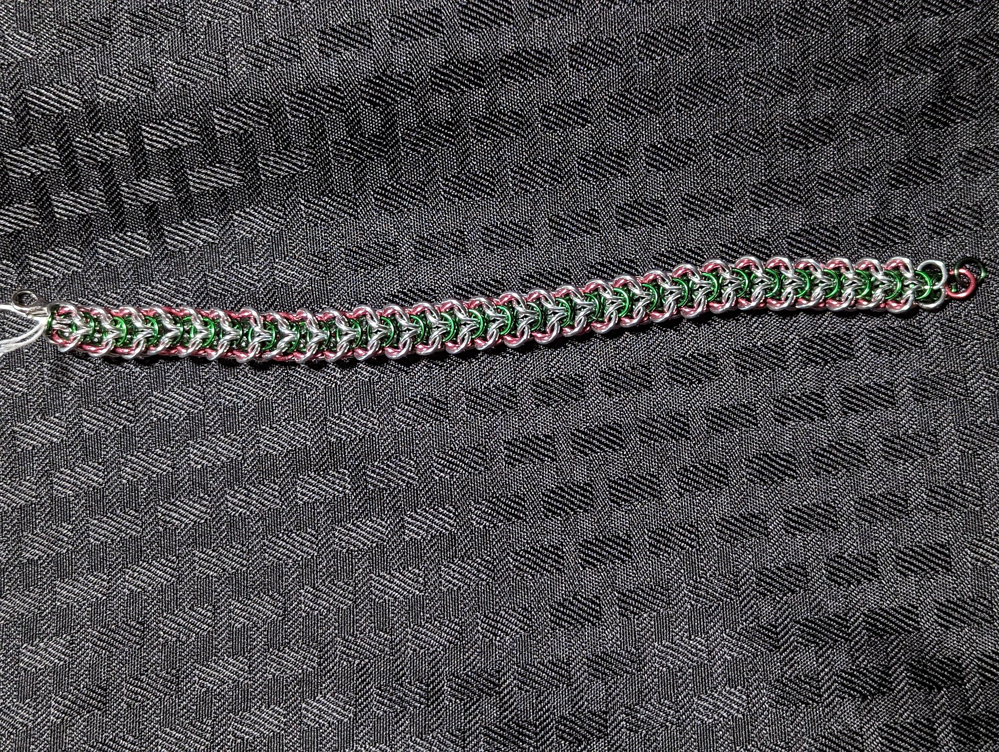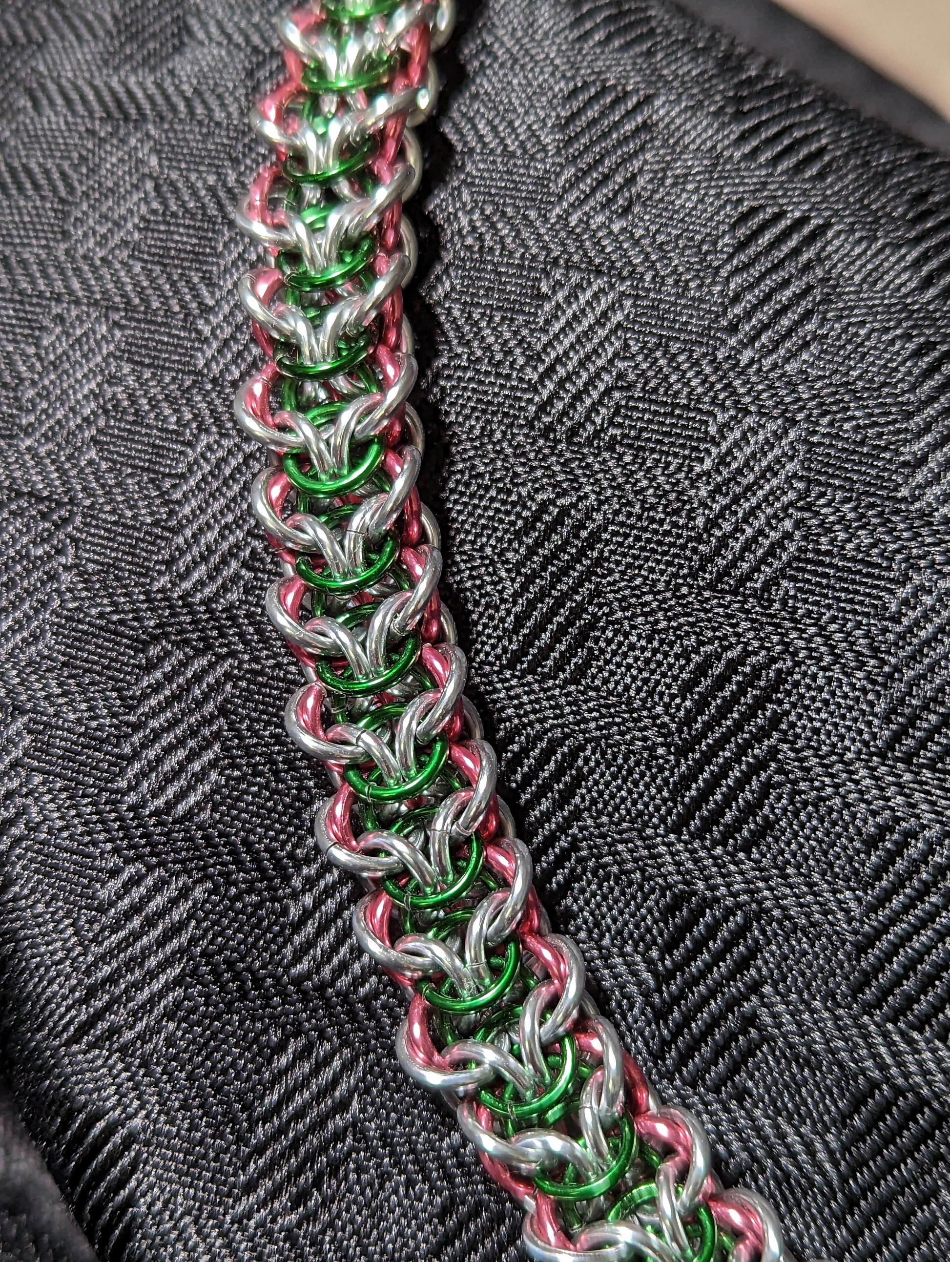Chainmaille Elf Braid Weave Bracelet in Silver, Green, and Pink