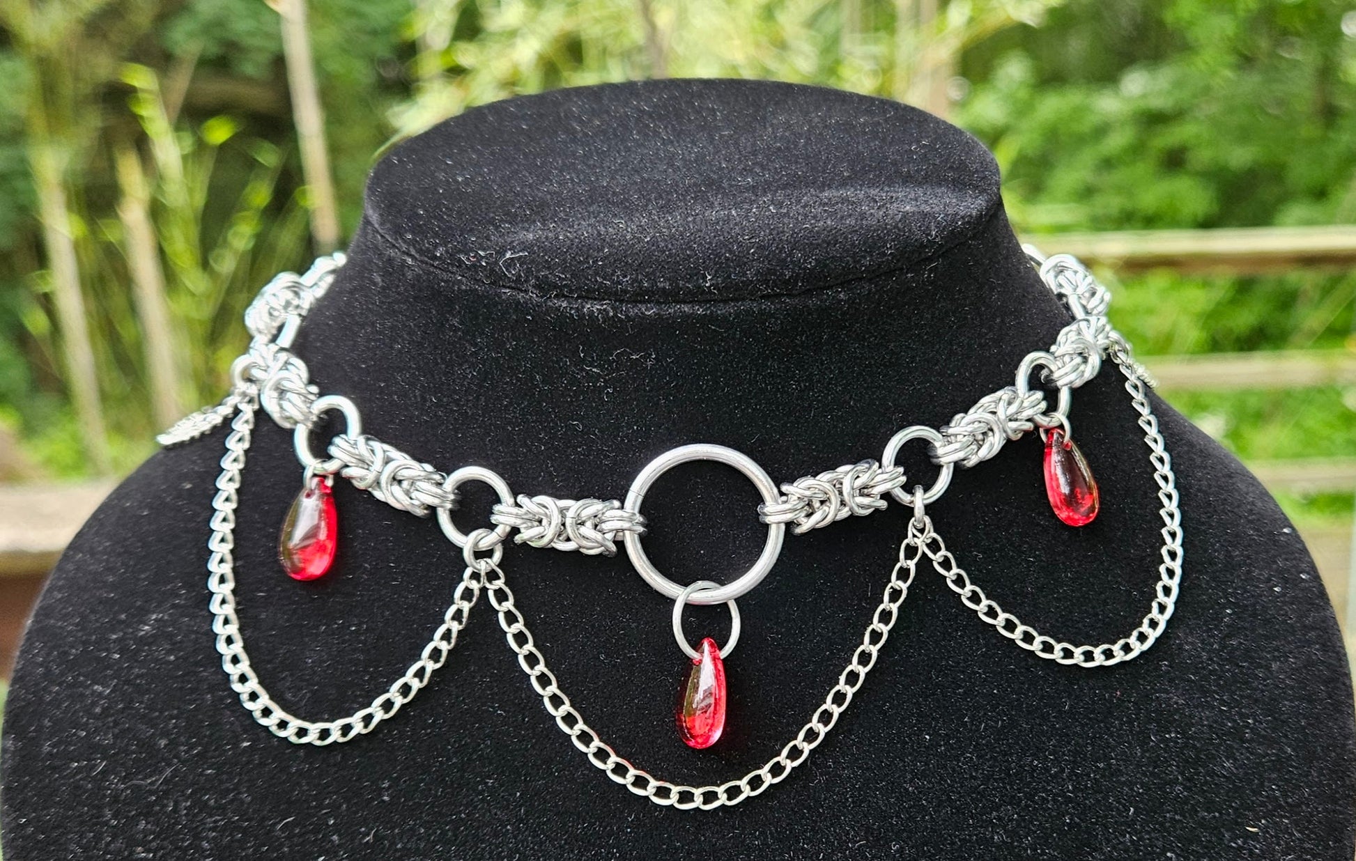 This piece is a lovely and enchanting work of metal with vampiric red drips framed in more silver colored chains. The size can easily be adjusted to better fit the receiver and if red isn't the color for you, the beads can be swapped out for another color as well prior to purchase.
